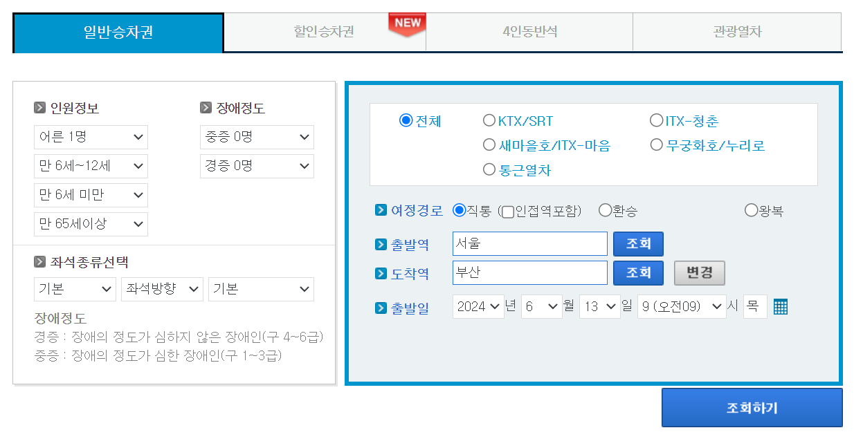 '할인승차권'은 일반승차권 오른쪽에 메뉴가 위치해있고, 4인 동반석 및 관광열차도 확인이 가능합니다.